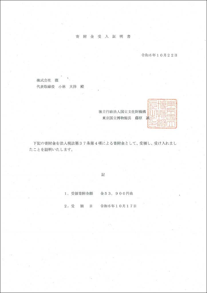 獏では毎月買取作品1点につき100円を東京国立美術館で行われる文化財の購入や修理、教育普及等の事業へ寄付しております。